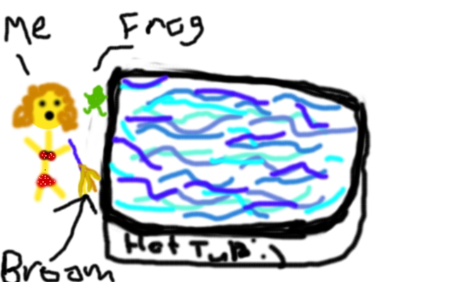 On the second day, I was at home alone and got in my hot tub. I was just minding my own business, when all of a sudden a giant frog jumped out of nowhere and attacked me. I jumped out of the hot tub as fast as I could and ran to the door. I grabbed the broom from inside and swung at the frog. It was scary.